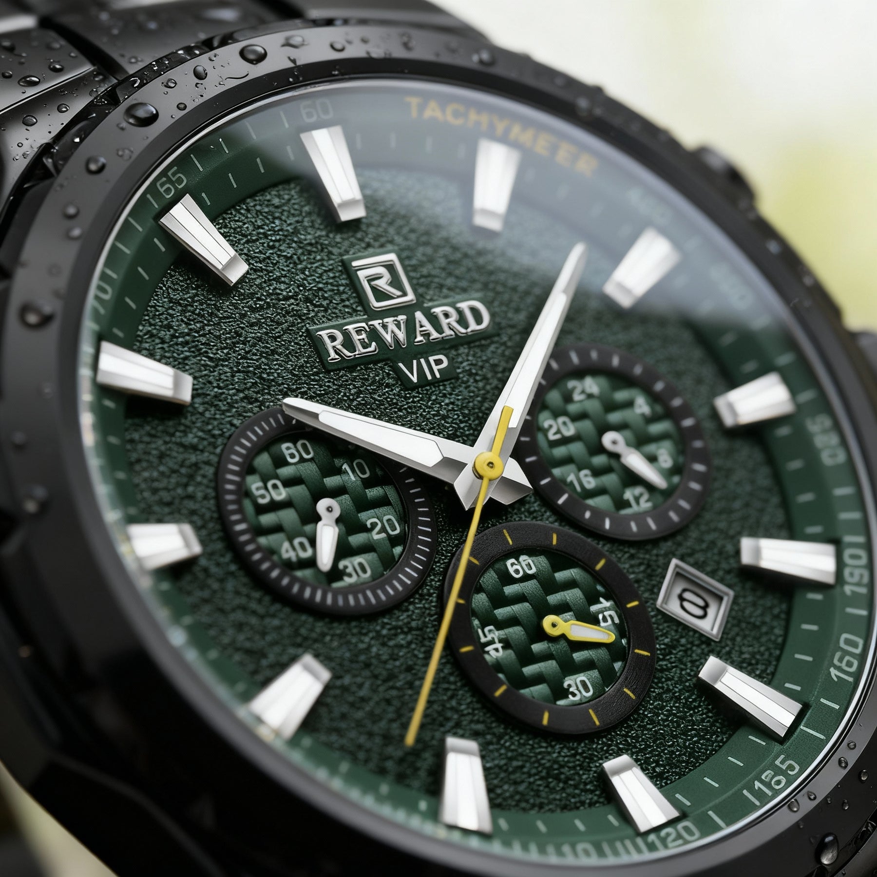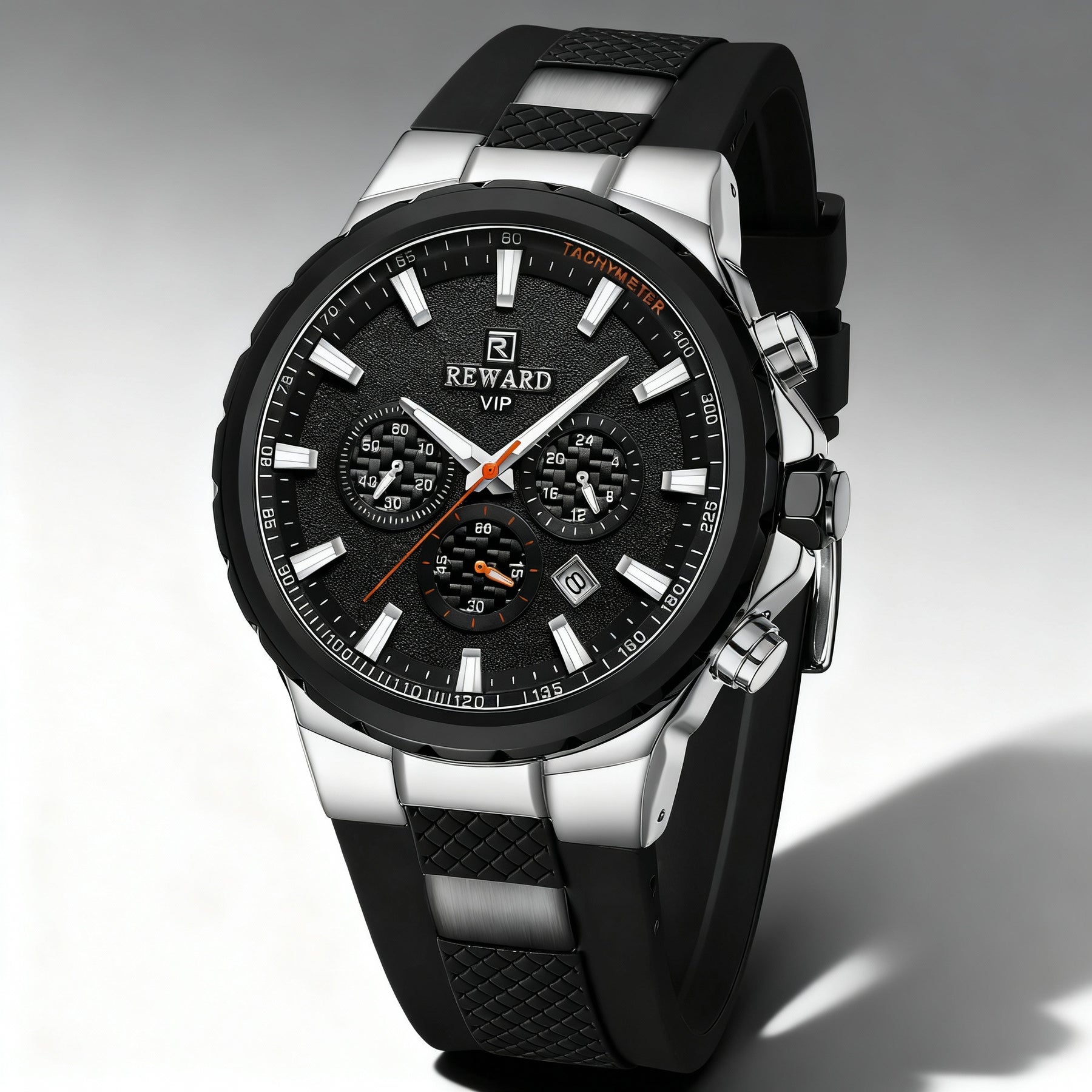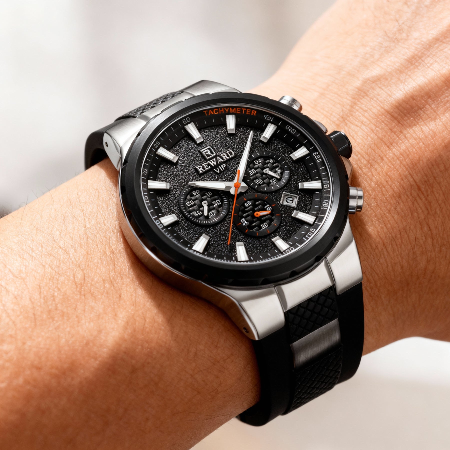 Engineered with a matte asphalt texture that grounds the dial, paired with carbon-fiber chronographs for sharp visual depth. Precision-cut markers and high-contrast hands keep the readout clean, secured by a military-grade silicone strap for grip and comfort.
