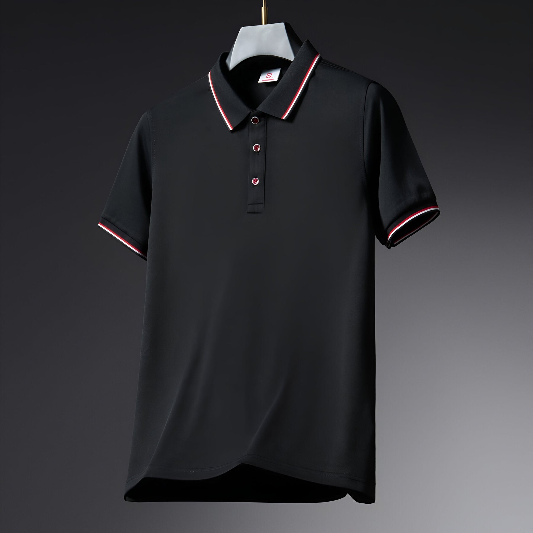 Designed with a textured weave that stays cool and smooth across the body, paired with an athletic fit and snug sleeve cuffs that sit close and hold shape. Highlighted stripe accents frame the edges, while tonal buttons keep the front clean and sharp.