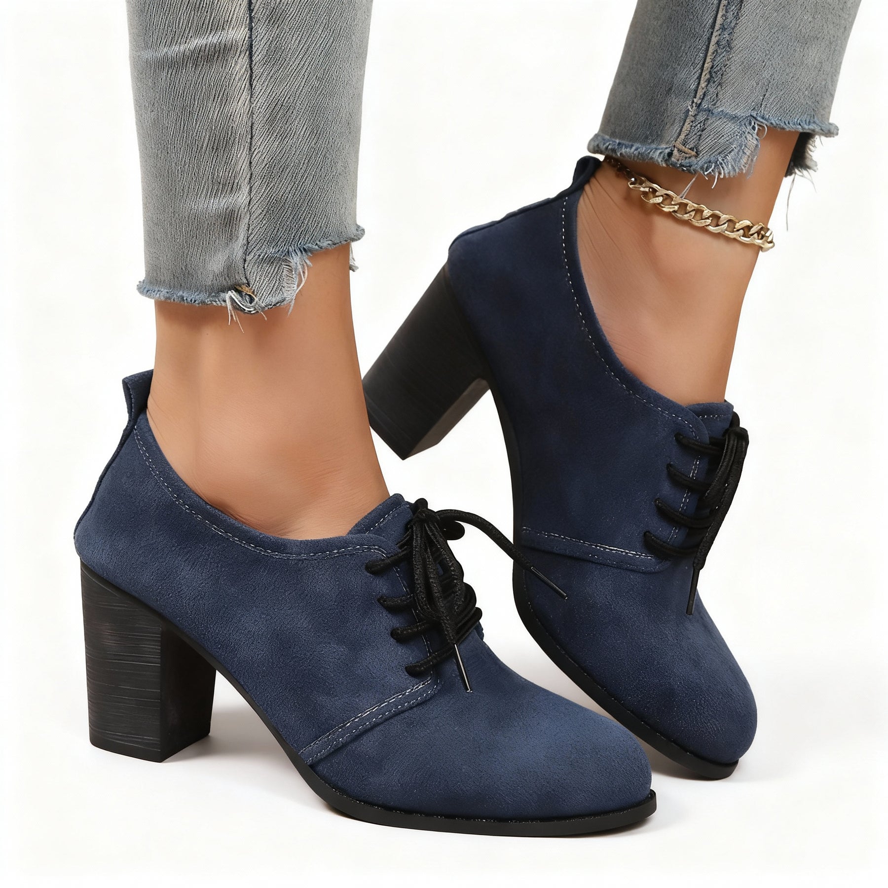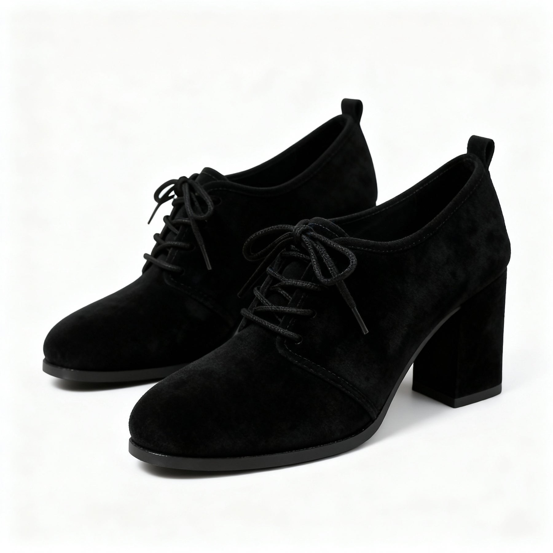 A soft leather lining wraps the foot for a smooth, breathable feel. The suede upper shows a velvety nap with fine texture, clean piping and tidy stitch lines that hold a crisp shape. Finished as a lace-up oxford on a steady block heel, it delivers grounded character with a poised, vintage edge.